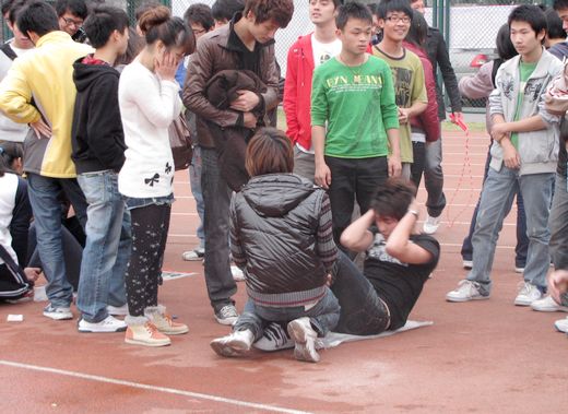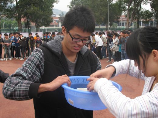 比赛在下午1时于东操开始,共有四个游戏第一个游戏为袋鼠跳夹乒乓球接力。这个游戏考研同学的运动协调性,参赛者用麻袋套住双脚像袋鼠一样跳到对面,然后用筷子夹住乒乓球回到起点。用时最少则获胜。