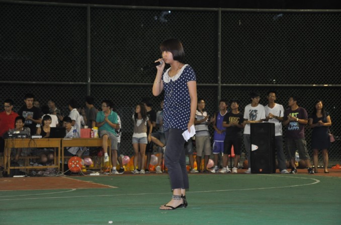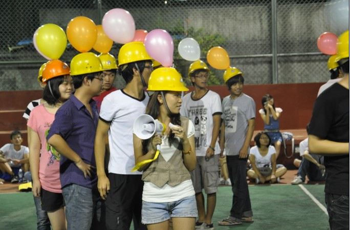晚会在张建炜和陈彦如两位主持人的调侃对话中正式开始,此时,月亮也早已迫不及待的露脸观看。由于是趣味晚会,主持人并没有拉长开场白的时间,很快便开始进行第一部分的游戏——超级蹲,抽取的新生和助导成五组竞赛,戴着绑有气球的安全帽的小组分别被命名为:鸡排大亨、福鼎肉片、老干妈肉丝炒饭等等,随着名称字数的增多游戏难度也越大,阵阵加油声喝欢笑声后,第一部分工管一班获胜。