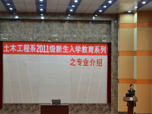 2011年9月27日19点,我院土木工程系在科报厅举行了2011级新生入学教育系列之专业介绍会。出席会议的有福州大学土木工程学院院长陈宝春、福州大学至诚学院土木工程系黄利频副教授以及福州大学至诚学院土木工程系系主任王国杰老师等。