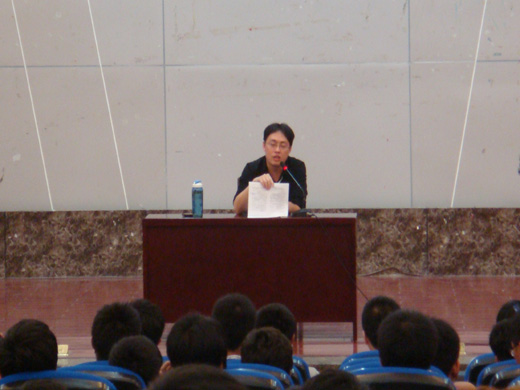 会议由苏童老师主讲,苏老师一上台便直奔主题,明确《学生手册》中的重点部分——学生事务。他从表彰和奖励的制度讲起,鼓励同学们好好学习,在大学初期养成良好的学习习惯,还希望同学们能全面发展。而后,他重点讲解了违纪处分,声明纪律处分的种类——“警告、严重警告、记过、留校察看、开除学籍”,并一一讲明了各处分的严重性,给同学们敲响警钟。接着,就考试问题苏老师着重且详细的带领大家学习了《学生手册》第七十二条关于考试违纪的内容,还列举的一个个身边生动形象的例子,嘱咐大家不要以身试法,原本严肃的话题,在苏老师幽默的讲说之后,引来台下阵阵笑声,使同学们更容易接受、更印象深刻。之后,就安全方面的问题,从防盗防骗和宿舍管理方面对大家进行了教育,希望大家严格遵守。会议接近尾声,苏童老师语重心长的向大家表示,他希望同学们既要注重学习,又要注重做人,要做一个讲文明、尊师重道的大学生。