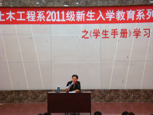 2011年10月10日19点,我院土木工程系在科报厅举行了2011级新生入学教育系列之《学生手册》学习。团委书记苏童老师、新生辅导员施玲老师、连培昆老师以及2011级全体新生参加了此次会议。