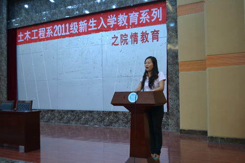 2011年10月12日19点,我院土木工程系在科报厅举行了2011级新生入学教育系列之入学适应教育的专题讲座。团委书记苏童老师、辅导员施玲以及2011级全体新生参加了此次讲座。