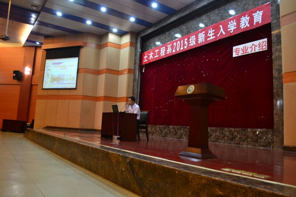 黄利频老师介绍结束后,接着则是由陈友杰老师向同学们作有关土木工程的专业介绍。和黄利频老师相同,首先陈友杰老师作了有关土木工程专业的简介,老师介绍到土木工程专业目前开设建筑工程和交通土建工程两个专业方向,专业致力于培养应用型、面向海西建设和区域经济、土木工程专业的本科人才。接着陈友杰老师向同学们列举了许多土木工程所应用的工程建设项目,例如像公路与城市道路、城市地铁和轨道交通、机场、港口、商业住宅以及工农业等。另外,陈友杰老师还着重介绍了土木工程专业所需要修读的课程,在力学方面,有三大力学、流体、弹性力学和土力学等专业基础课对于同学们来说是至关重要的课程,也是很难修读的课程,另外工程地质、测量学、建筑材料学、房屋建筑学以及其他工程设计学也都是对同学们的严苛考验,陈友杰老师强调土木工程专业课程繁多,内容复杂,所以在修读专业基础课时同学们要勤奋学习,刻苦钻研,否则就会堆积成山,难以毕业。同时,陈友杰老师还介绍了以往我系专业的毕业情况,以此来勉励同学们在今后的学习中能够脚踏实地,努力学习。